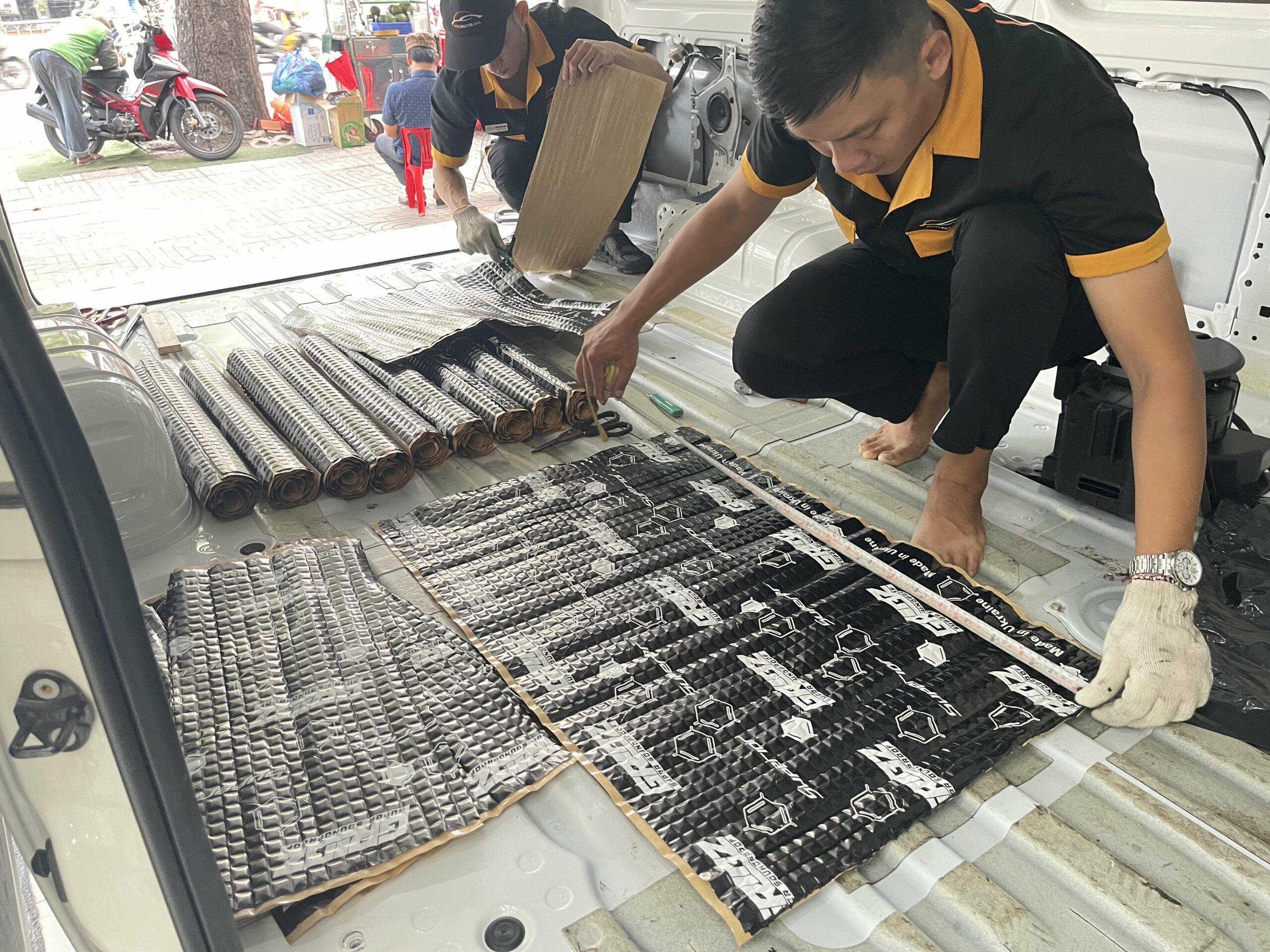 Nguồn gây ồn: Tiếng vọng từ gầm xe, tiếng gió rít, tiếng đất đá văng, tiếng lốp ma sát,… Cần tháo toàn bộ ghế ngồi trên xe, mở tấm nỉ phủ sàn xe. Sau đó dán miếng cách âm và bông tiêu âm.