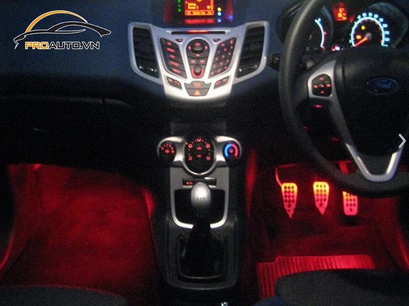 Độ đèn LED viền nội thất xe Ford Fiesta là sử dụng những dải đèn viền để trang trí trên bảng điều khiển trung tâm, các thiết bị điện tử và đặc biệt là cửa trong của xe.