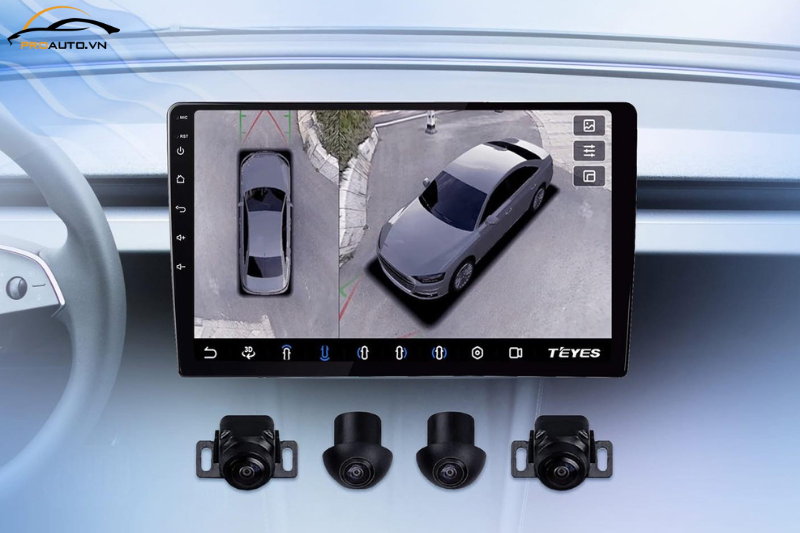 Trang bị camera 360° trên màn hình Teyes CC3L 360 hiển thị toàn bộ không gian quanh xe theo thời gian thực, hỗ trợ lái xe an toàn tuyệt đối. Các góc nhìn trước – sau – trái – phải hiển thị rõ ràng, trực quan, giúp: