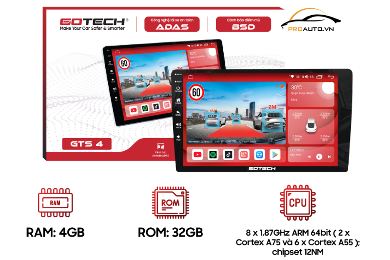 Màn hình ô tô thông minh Gotech GTS4 là sản phẩm tiên tiến nhất từ Gotech, kết hợp hoàn hảo giữa giải trí hiện đại và công nghệ an toàn vượt trội. Được trang bị các tính năng giải trí đỉnh cao, GTS4 mang đến trải nghiệm thư giãn, thoải mái cho người dùng. Đồng thời, hệ thống cảnh báo lái xe ADAS – BSD tiên tiến hỗ trợ tối đa trong việc đảm bảo an toàn trên mọi hành trình, giúp mỗi chuyến đi trở nên tiện lợi và an tâm hơn bao giờ hết.