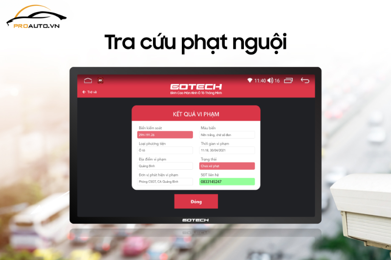 Tính năng GT Phạt nguội trên màn hình Gotech GTS4 giúp tra cứu vi phạm nhanh chóng và tiện lợi. Chỉ vài thao tác, người dùng có thể xem thông tin phạt nguội như thời gian, địa điểm vi phạm và trạng thái nộp phạt, cập nhật liên tục từ các nguồn uy tín như Cục CSGT và CSGT các thành phố lớn.