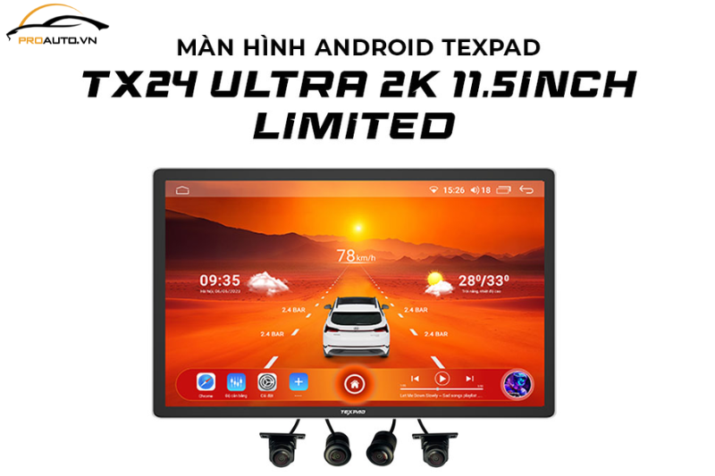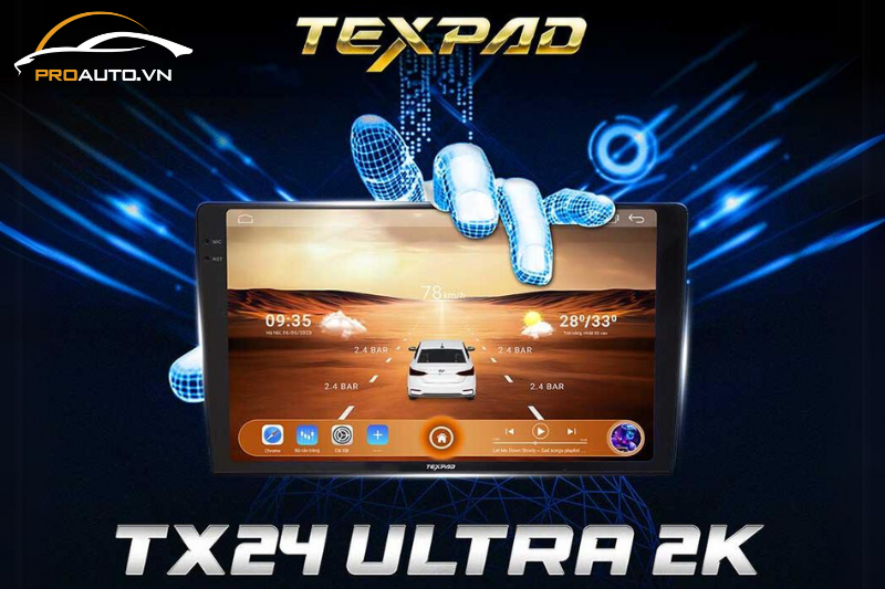 TexPad TX24 Ultra 2K là màn hình Android cao cấp với kích thước 9 inch hoặc 10 inch, nổi bật với thiết kế tràn viền sang trọng. Phù hợp với 90% các dòng xe phổ thông hiện nay. TexPad TX24 Ultra 2K được trang bị chip UIS 7862S mạnh mẽ, 4GB RAM và 32GB ROM, đáp ứng tốt mọi nhu cầu từ xem phim, nghe nhạc, theo dõi tin tức, sử dụng bản đồ, đến chơi game. Ưu điểm của TexPad TX24 Ultra 2K: