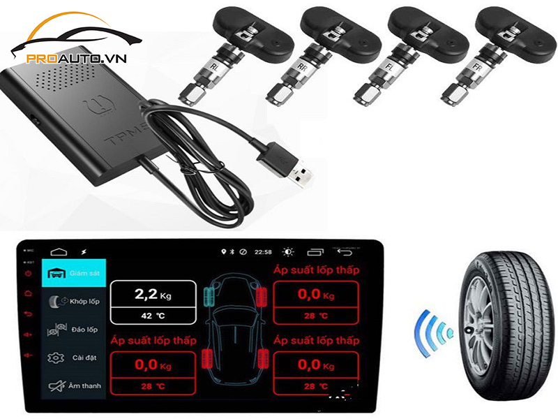 Thiết bị cảm biến áp suất lốp là một bộ phận theo dõi áp suất và nhiệt độ bên trong cho phần lốp xe người dùng. Từ đó đưa ra những cảnh báo bằng âm thanh và hình ảnh được hiển thị qua màn hình DVD Android trên xe hoặc gửi thông tin thông báo cụ thể qua điện thoại thông minh người dùng vô cùng tiện lợi để theo dõi.